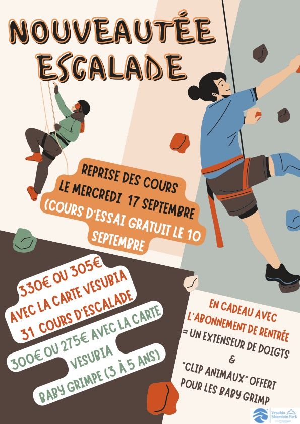 Le Vésubia Mountain Park vous propose des cours d'escalade et de natation pour l'année 2025 - 2026.Début des cours la semaine du 17/09/2025+ d'infos au 04 93 23 20 30