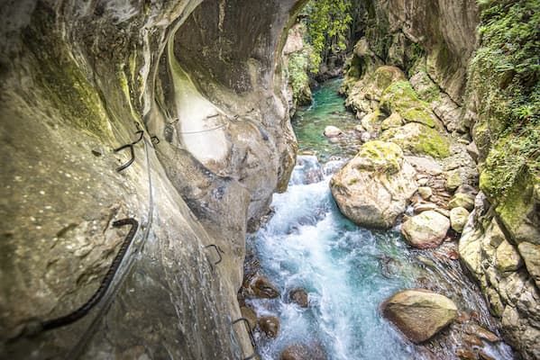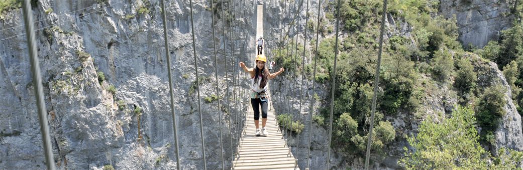 Very easy part for beginners. Passage over a small Riou of transparent green water with small bridges, beams and bars along a moss cliff. Little height (about 10 meters) and a long crossing. Perfect introduction to via ferrata.