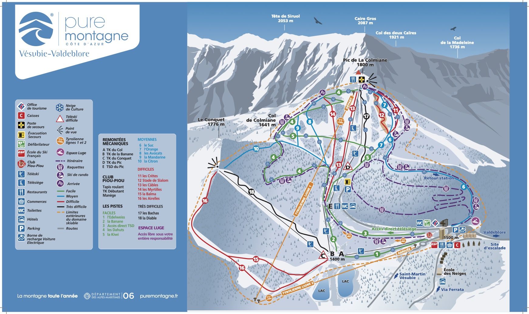 Implanté entre 1400 et 1800 mètres d’altitude (sommet du Pic de la Colmiane), le domaine skiable de La Colmiane représente 30 kilomètres de pistes de ski desservies par 5 remontées mécaniques dont 1 télésiège débrayable. 18 pistes au total serpentent entre pentes raides, passages plus vallonnés et replats propices à l’apprentissage du ski.
